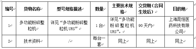 凯时尊龙集团上海昆恒医药科技有限公司多功能粉碎整粒机采购招标公告