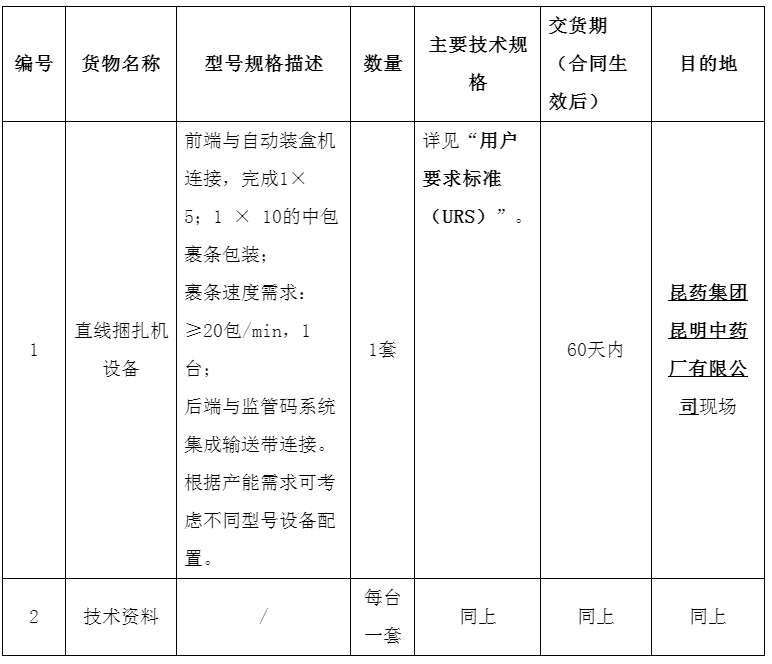 2021年凯时尊龙集团昆明中药厂有限公司六车间直线捆扎机设备采购招标公告